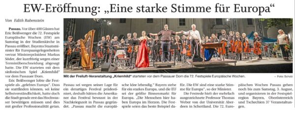 Im Mittelpunkt der Eröffnung der 72. Festspiele Europäische Wochen in der Studienkirche St. Michael in Passau ist die Festrede von Prof. Thomas Weber, einem mehrfach ausgezeichneten Historiker und Hochschulprofessor, der an der Universität Aberdeen (UK) lehrt, gestanden. Sein Vortrag, der sehr große Zustimmung fand, stand unter dem Thema „Europäische Zukunft gestern und heute – neue Erzählungen, mehr Zuversicht“.