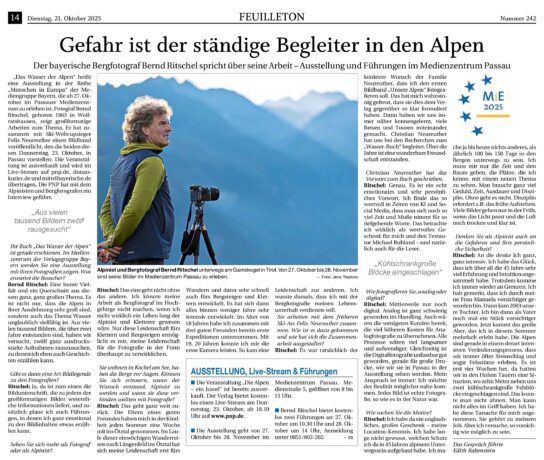 Heute ist die Ausstellung „Das Wasser der Alpen“ im Medienzentrum Passau aufgebaut worden. Es werden 12 großformatige Naturfotografien des Alpinisten und Bergfotografen  Bernd Ritschel gezeigt.