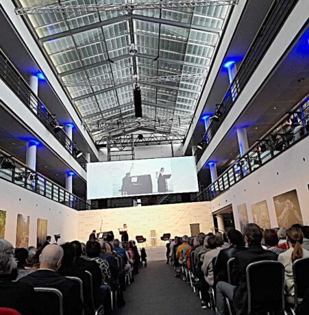 Der österreichische Komponist Peter WesenAuer hat ein Stück für Klavier und Querflöte eigens für diesen Matinee geschrieben. Ideengeber Basil H. A. Coleman, Generalmusikdirektor des Landestheaters Niederbayern, saß am Klavier, Flöte spielte Hazar Birkan. Das Stück in zwei Sätzen heißt „Eins, zwei, drei, die Kunst ist frei!“ Der erste Teil assoziiert die Musik der 20er Jahre, ist voller Sentiment und Lyrik; der zweite wird getragen von dahineilender Rhythmik und erfrischender Fröhlichkeit. Die Noten scheinen sich zu überschlagen. Ein Bravo an die Akteure.