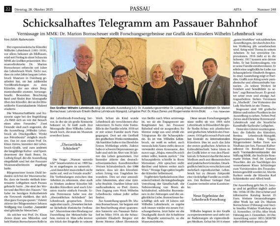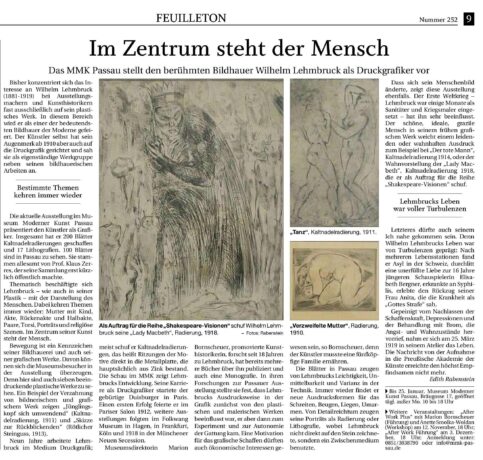 Sie hat u. a. eine viel beachtete Monografie herausgebracht. In Passau zeigt sie Werke aus der Privatsammlung von Prof. Klaus Zerres, der damit seine Sammlung erstmals öffentlich macht. Zudem stellt sie ihre Forschungsergebnisse vor, die eine Neubewertung Wilhelm Lehmbrucks als Grafiker als Ergebnis haben.