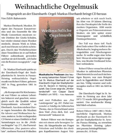 Der Musiker, Dirigent des Passauer Konzertvereins und des Ensemble für Alte Musik Consortium musicum, hat weihnachtliche Orgelmusik von Robert Führer, geboren 1807 in Prag, gestorben 1861 in Wien auf der Eisenbarth-Orgel in Passau-Heining gespielt und eine CD herausgebracht.
