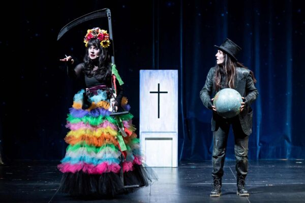 Als witzige Typenkomödie gestalten sich die Auftritte der Todesboten aus aller Welt – weil die Engerl die Einladungen zum Boandlkramer-Prozess verloren haben. Da kommt der Schweizer Sensenmann, ausgestattet wie ein Bergmann mit Kraxe am Rücken Sicherheitshelm am Kopf (Paul Kaiser), Sicherheitshelm und gibt sich als neutraler Vermittler, der Tod aus Schwaben ist ein eleganter Herr in Frack und Zylinder (Reinhard Peer), der aus Ostfriedland kommt im Ostfriesennerz mit Rudern – und zu spät (ebenfalls Reinhard Peer), der Tod aus Sachsen (Julian Ricker) ist ein Pragmatischer, der die Wiedervereinigung bereut und mit Sackkarre seinen Toten befördert. Die schillerndste Figur ist die Herrscherin der Unterwelt aus Mexiko: La Santa Muerte (Nikola Norgauer) ist die lockende Verführerin, die sich gerne dem Genuss hingibt. Sie trägt ein markantes, schwarz-buntes Kostüm, wie es von einem Bild der mexikanischen Künstlerin Frida Kahlo stammen könnte (Kostüme: Ines Schmiedt).