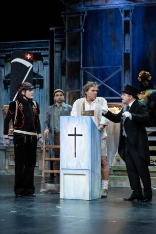 Joachim Vollrath ist ein solider Portner, der gerne feiert und sich am Ende doch den neuen Ideen seiner Engerl offen zeigt. Diese (Katharina Schmirl, Katharina Elisabeth Kram, Korbinian Greindl) werden als süße freche Putti dargestellt. Herrlich wie die beiden den Portner anbeten und eine Formation mit abgewinkeltem Bein bilden, wie sie in vielen Kirchen zu sehen ist. Es sind oft Kleinigkeiten an dieser Inszenierung, die erfreuen. Da zeigt sich Wolfgang Maria Bauer als Meister seines Fachs.